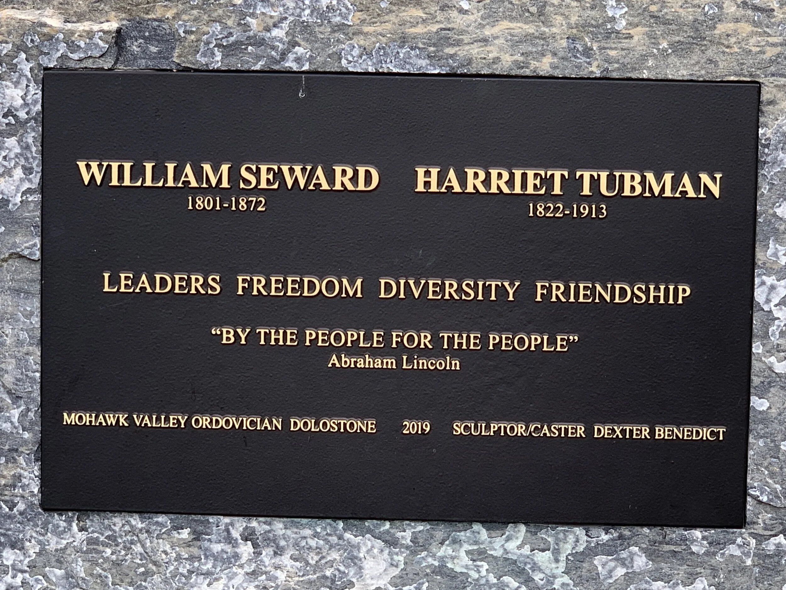 City officials dedicated the William Seward and Harriet Tubman Statue on May 17, 2019, at the corner of Clinton and Liberty Streets in downtown Schenectady. Frank Wicks, an emeritus mechanical engineering professor at Union College, initiated the fundraising efforts to create the monument. Local artist, Dexter Benedict, was commissioned to create the life-size figures in bronze standing on Mohawk Valley dolostone surrounded by native plants.